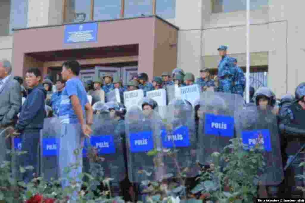На площади перед зданием полномочного представительства правительства в Иссык-Кульской области с утра проходит два митинга. В одном участвовали около 50 должников банков и микрокредитных организаций, а во втором около 150 недовольных меморандумом, который подписало правительство Кыргызстана с канадской компанией Centerra Gold Inc. Фотографии предоставлены Kloop Media Foundation, авторы фотографий Кундуз Сырдырбаева и Тимур Акбашев.